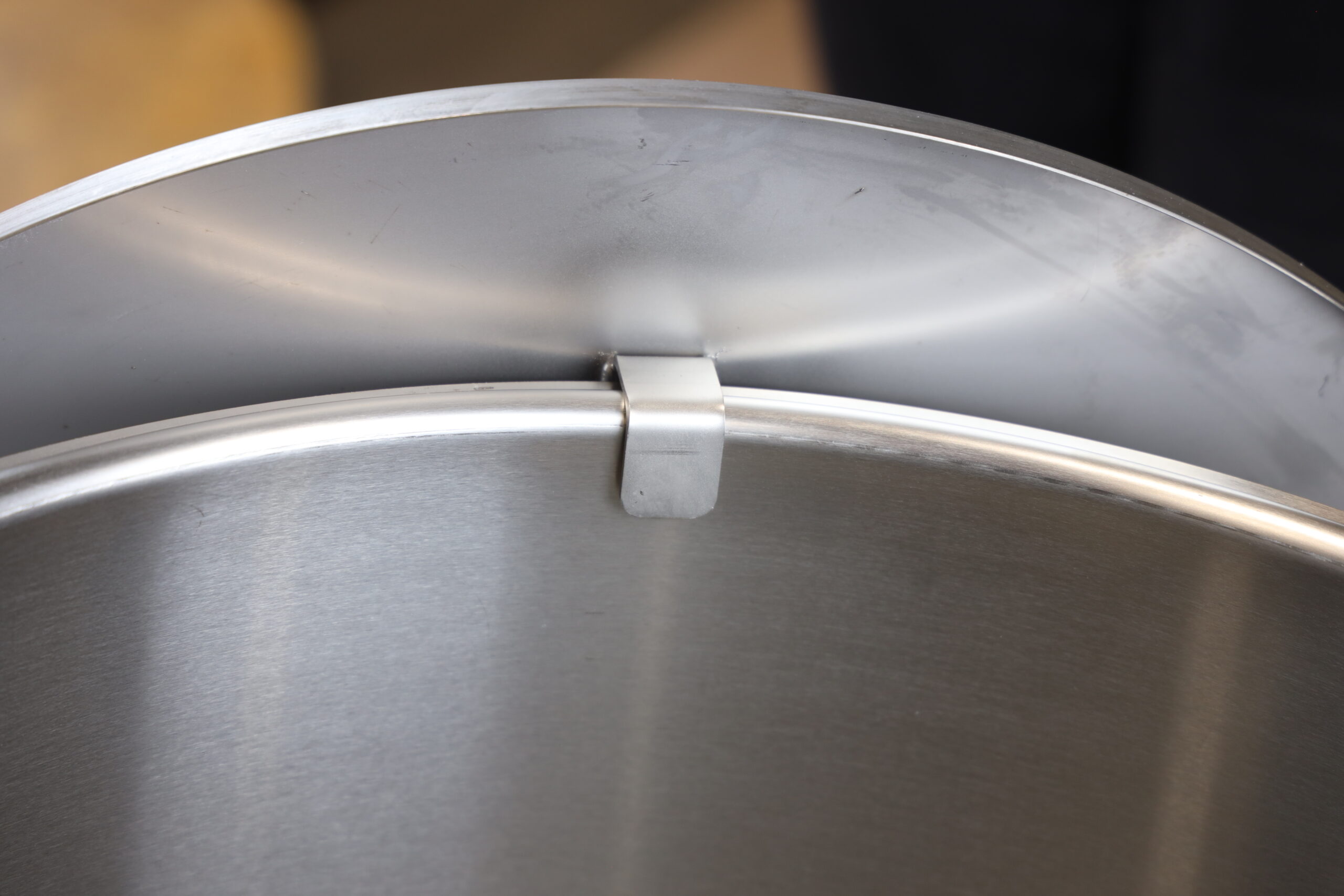 Interior and exterior finish is polished to food grade quality. The drum bottom has a heavy duty wear ring and the top has an easy to grip sanitary open rim. Drum capacity is 55 gallons.