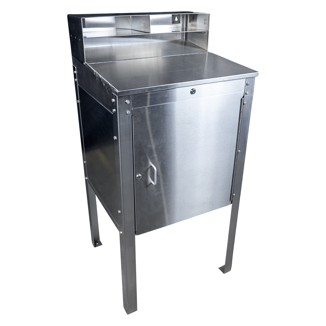 Add the optional Mobile Stand if a moving work area is needed. Optional stand is constructed with 10 gauge T-304 stainless steel and rolls easily on four 5″ swivel casters (2 supplied with brakes). The mobile stand raises working height to 42″ and includes a stainless steel under shelf.